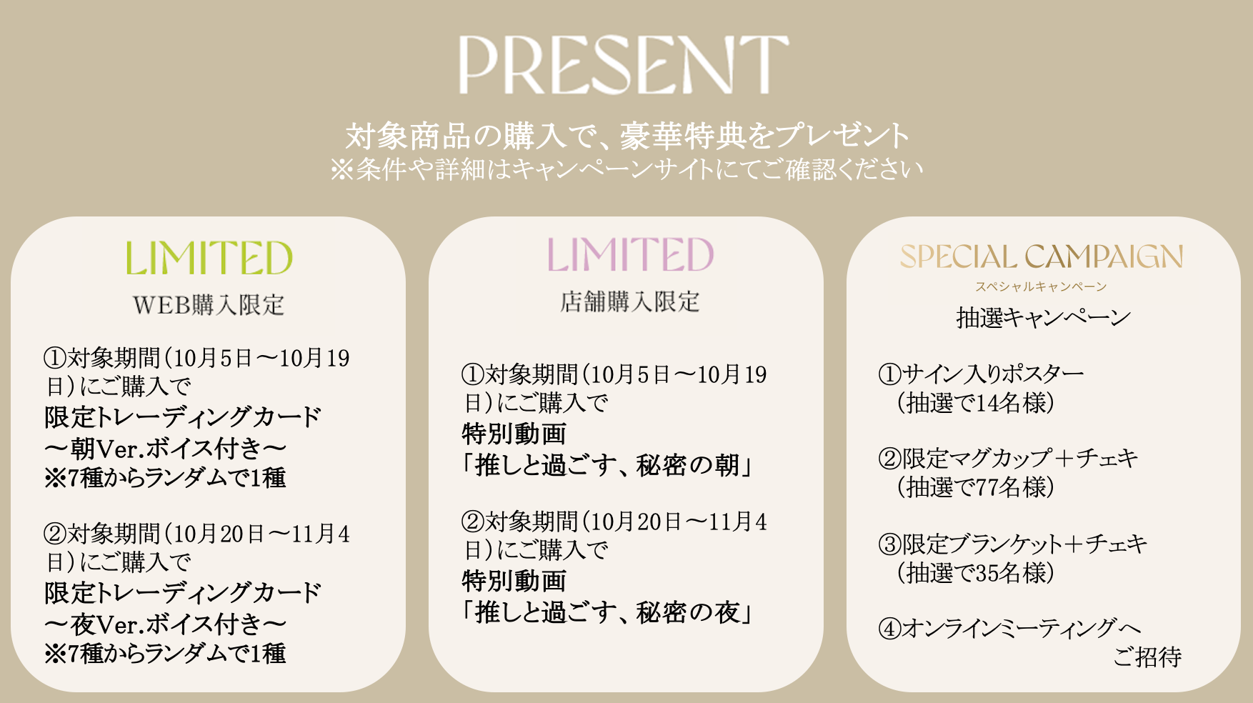 キャンペーン期間中に商品を購入すると、オンラインファンミーティングへのご招待や限定動画、ボイス付きトレーディングカードのプレゼントなど豪華特典が当たります。