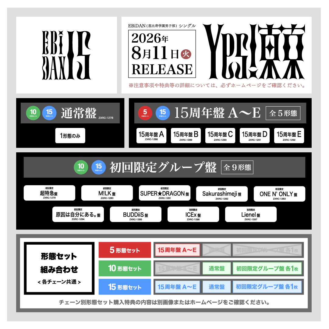シングルは通常盤・各グループ盤・15周年記念盤を合わせた全15形態でリリースされ、カップリングには、昨年の『EBiDAN THE LIVE 2025 HOTEL NINE STAR』でも披露された「好きだから走れ!!!!!!!」を収録。
